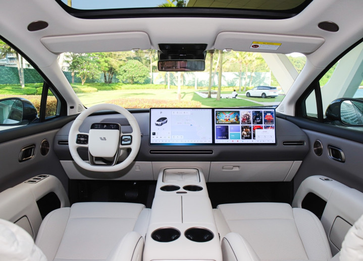 进入车内,座舱以15.7英寸OLED双联屏为核心,取消传统仪表盘,由AR-HUD显示关键信息,并且还支持导航、听歌、语音控制等功能。该车配备四辐式多功能方向盘,多功能按键区域采用亮黑色装饰件点缀,并继续配备方向盘交互屏,能够显示行车信息、续航信息等。方向盘触控屏集成挡位与电量交互。高通骁龙8295P芯片支持六区域语音识别,后排21.4英寸防眩光吸顶屏支持4K流媒体与手势控制。